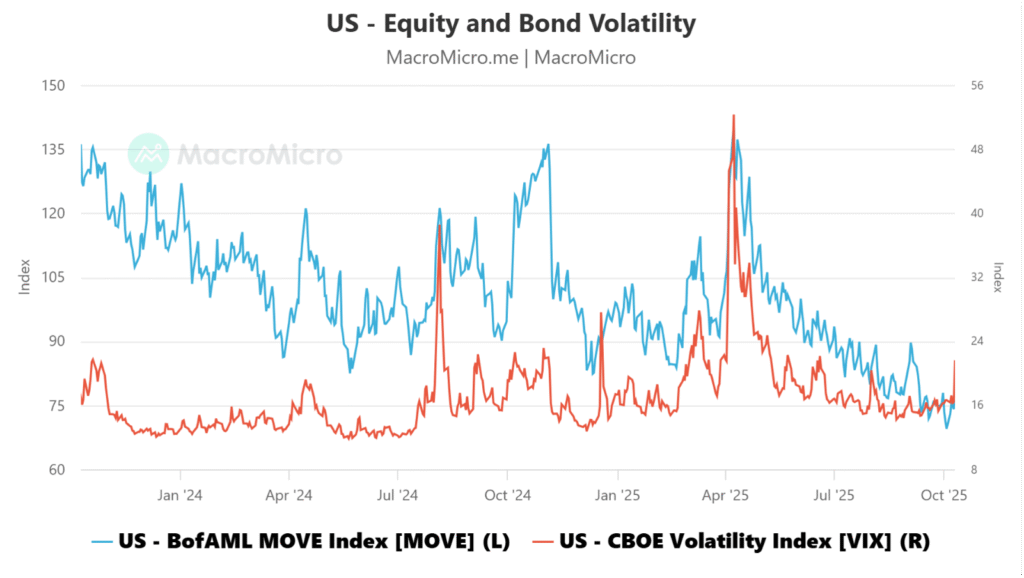 The chart tracks U.S. equity and bond market volatility from late 2023 to October 2025. The BofA MOVE Index (blue), representing bond volatility, shows significant fluctuations, peaking around late 2024 and early 2025 before trending downward. The CBOE VIX Index (red), measuring stock volatility, mirrors these movements with smaller spikes, notably aligning with major market stress events in early 2025. Both indices decline through mid-2025, indicating easing market uncertainty. Last Friday, both indices spiked up amid heightened uncertainty around US Government Shutdown and latest 100% tariff imposition on China that will take effect from 1 November 2025. Overall, bond volatility remained more elevated and volatile than equity volatility throughout the period, reflecting shifting macroeconomic and policy dynamics. Will equity volatility settle at a higher level than bond volatility for the rest of the year?