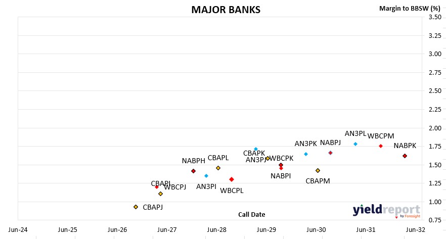 The average trading margin across bank hybrids remains around 1.62%, suggesting a stable risk premium environment. Most securities are trading slightly above face value, indicating healthy demand and perceived creditworthiness.