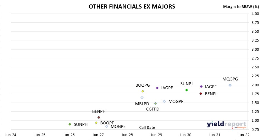 YIELD**Challenger CGFPC Capital Notes 3 25/05/2026 4.60% -0.08% 102.66 7.94% Nat Aust Bank NABPF Capital Notes 3 17/06/2026 4.00% 0.64% 101.94 7.40% Suncorp SUNPH Capital Notes 3 17/06/2026 3.00% 0.89% 101.13 6.48% Macquarie Group MQGPD Capital Notes 4 10/09/2026 4.15% 0.59% 102.95 7.48% CBA CBAPJ PERLS 13 20/10/2026 2.75% 0.93% 101.56 6.21% Latitude LFSPA Capital Notes 27/10/2026 4.75% 6.44% 98.5 8.44% Westpac WBCPJ Capital Notes 7 22/03/2027 3.40% 1.20% 102.8 6.77% CBA CBAPI PERLS 12 20/04/2027 3.00% 1.11% 102.5 6.40% Bank of Queensland BOQPF Capital Notes 2 14/05/2027 3.80% 0.94% 104.19 7.07% Bendigo Bank BENPH Capital Notes 15/06/2027 3.80% 1.09% 104.019 7.07% Macquarie Group MQGPE Capital Notes 5 20/09/2027 2.90% 0.84% 102.7 6.24% Nat Aust Bank NABPH Capital Notes 5 17/12/2027 3.50% 1.41% 103.94 6.78% ANZ Bank AN3PI Capital Notes 6 20/03/2028 3.00% 1.35% 103.5 6.34% CBA CBAPL PERLS 15 15/06/2028 2.85% 1.45% 103.18 6.21% Suncorp SUNPI Capital Notes 4 17/06/2028 2.90% 1.54% 103.1 6.26% Westpac WBCPL Capital Notes 9 22/09/2028 3.40% 1.31% 105.3 6.61% Macquarie Bank MBLPD Capital Notes 3 7/12/2028 2.90% 1.64% 103.4 6.25% Bank of Queensland BOQPG Capital Notes 3 15/12/2028 3.40% 1.82% 104.2 6.67% Judo Capital JDOPA Capital Notes 16/02/2029 6.50% 4.68% 111.71 9.56% ANZ Bank AN3PJ Capital Notes 7 20/03/2029 2.70% 1.72% 102.85 6.09% Challenger CGFPD Capital Notes 4 25/05/2029 3.60% 1.47% 106.5 6.72% CBA CBAPK PERLS 14 15/06/2029 2.75% 1.59% 103.54 6.09% IAG IAGPE Capital Notes 2 15/06/2029 3.50% 1.92% 104.9 6.73% Macquarie Group MQGPF Capital Notes 6 12/09/2029 3.70% 1.54% 107 6.78% Nat Aust Bank NABPI Capital Notes 6 17/09/2029 3.15% 1.50% 105.34 6.36% Westpac WBCPK Capital Notes 8 21/09/2029 2.90% 1.45% 104.74 6.17% ANZ Bank AN3PK Capital Notes 8 20/03/2030 2.75% 1.65% 104 6.07% CBA CBAPM PERLS 16 17/06/2030 3.00% 1.43% 105.92 6.19% Suncorp SUNPJ Capital Notes 5 17/06/2030 2.80% 1.86% 103.51 6.14% Nat Aust Bank NABPJ Capital Notes 7 17/09/2030 2.80% 1.66% 104.46 6.08% Bendigo Bank BENPi Capital Notes 2 13/12/2030 3.20% 1.76% 105.85 6.38% Insurance Australia IAGPF Capital Notes 3 15/12/2030 3.20% 1.96% 105.14 6.43% ANZ Bank AN3PL Capital Notes 9 20/03/2031 2.90% 1.78% 104.78 6.16% Westpac WBCPM Capital Notes 10 22/09/2031 3.10% 1.75% 106.14 6.27% Macquarie Group MQGPG Capital Notes 7 15/12/2031 2.65% 1.99% 103.15 6.02% Nat Aust Bank NABPK Capital Notes 8 17/03/2032 2.60% 1.62% 104.76 5.88% ASX-Listed Hybrids (Non-standard) 14.10.25