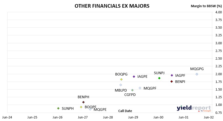 YIELD**Challenger CGFPC Capital Notes 3 25/05/2026 4.60% -0.11% 102.66 7.94% Nat Aust Bank NABPF Capital Notes 3 17/06/2026 4.00% 0.63% 101.94 7.40% Suncorp SUNPH Capital Notes 3 17/06/2026 3.00% 0.89% 101.13 6.48% Macquarie Group MQGPD Capital Notes 4 10/09/2026 4.15% 0.58% 102.95 7.48% CBA CBAPJ PERLS 13 20/10/2026 2.75% 0.93% 101.56 6.21% Latitude LFSPA Capital Notes 27/10/2026 4.75% 6.47% 98.50 8.44% Westpac WBCPJ Capital Notes 7 22/03/2027 3.40% 1.20% 102.80 6.76% CBA CBAPI PERLS 12 20/04/2027 3.00% 1.11% 102.50 6.39% Bank of Queensland BOQPF Capital Notes 2 14/05/2027 3.80% 0.93% 104.19 7.06% Bendigo Bank BENPH Capital Notes 15/06/2027 3.80% 1.08% 104.02 7.06% Macquarie Group MQGPE Capital Notes 5 20/09/2027 2.90% 0.86% 102.70 6.23% Nat Aust Bank NABPH Capital Notes 5 17/12/2027 3.50% 1.42% 103.94 6.78% ANZ Bank AN3PI Capital Notes 6 20/03/2028 3.00% 1.35% 103.50 6.33% CBA CBAPL PERLS 15 15/06/2028 2.85% 1.46% 103.18 6.20% Suncorp SUNPI Capital Notes 4 17/06/2028 2.90% 1.54% 103.10 6.26% Westpac WBCPL Capital Notes 9 22/09/2028 3.40% 1.31% 105.30 6.60% Macquarie Bank MBLPD Capital Notes 3 7/12/2028 2.90% 1.65% 103.40 6.24% Bank of Queensland BOQPG Capital Notes 3 15/12/2028 3.40% 1.82% 104.20 6.67% Judo Capital JDOPA Capital Notes 16/02/2029 6.50% 4.64% 111.71 9.50% ANZ Bank AN3PJ Capital Notes 7 20/03/2029 2.70% 1.72% 102.85 6.08% Challenger CGFPD Capital Notes 4 25/05/2029 3.60% 1.48% 106.50 6.72% CBA CBAPK PERLS 14 15/06/2029 2.75% 1.59% 103.54 6.09% IAG IAGPE Capital Notes 2 15/06/2029 3.50% 1.92% 104.90 6.73% Macquarie Group MQGPF Capital Notes 6 12/09/2029 3.70% 1.54% 107.00 6.78% Nat Aust Bank NABPI Capital Notes 6 17/09/2029 3.15% 1.50% 105.34 6.36% Westpac WBCPK Capital Notes 8 21/09/2029 2.90% 1.45% 104.74 6.16% ANZ Bank AN3PK Capital Notes 8 20/03/2030 2.75% 1.65% 104.00 6.06% CBA CBAPM PERLS 16 17/06/2030 3.00% 1.43% 105.92 6.19% Suncorp SUNPJ Capital Notes 5 17/06/2030 2.80% 1.86% 103.51 6.14% Nat Aust Bank NABPJ Capital Notes 7 17/09/2030 2.80% 1.66% 104.46 6.08% Bendigo Bank BENPi Capital Notes 2 13/12/2030 3.20% 1.76% 105.85 6.38% Insurance Australia IAGPF Capital Notes 3 15/12/2030 3.20% 1.96% 105.14 6.43% ANZ Bank AN3PL Capital Notes 9 20/03/2031 2.90% 1.78% 104.78 6.16% Westpac WBCPM Capital Notes 10 22/09/2031 3.10% 1.75% 106.14 6.27% Macquarie Group MQGPG Capital Notes 7 15/12/2031 2.65% 1.99% 103.15 6.02% Nat Aust Bank NABPK Capital Notes 8 17/03/2032 2.60% 1.62% 104.76 5.87% ASX-Listed Hybrids (Non-standard) 16.10.25