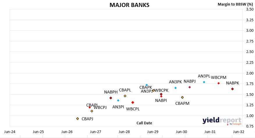 • Westpac hybrids (WBCPJ–WBCPM) remained broadly unchanged, clustered around 1.35%–1.65%, maintaining their mid-range position on the curve.