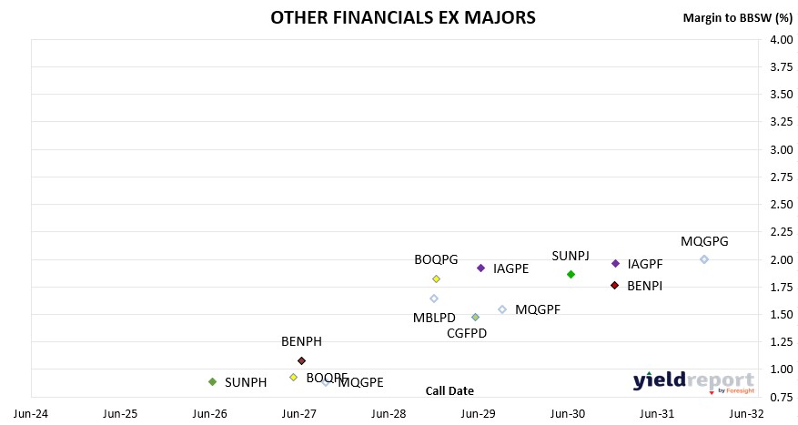 • Macquarie Group’s MQGPD was steady, offering a 4.15% margin including franking credits and a running yield of 7.40%, making it one of the stronger performers among non-major peers.