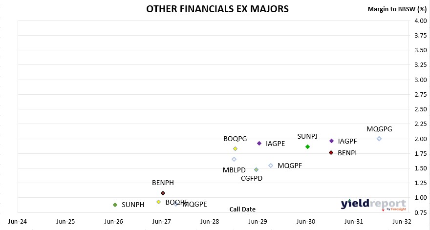 YIELD**Challenger CGFPC Capital Notes 3 25/05/2026 4.60% -0.16% 102.66 7.87% Nat Aust Bank NABPF Capital Notes 3 17/06/2026 4.00% 0.60% 101.94 7.33% Suncorp SUNPH Capital Notes 3 17/06/2026 3.00% 0.88% 101.13 6.40% Macquarie Group MQGPD Capital Notes 4 10/09/2026 4.15% 0.56% 102.95 7.41% CBA CBAPJ PERLS 13 20/10/2026 2.75% 0.93% 101.56 6.13% Latitude LFSPA Capital Notes 27/10/2026 4.75% 6.52% 98.50 8.37% Westpac WBCPJ Capital Notes 7 22/03/2027 3.40% 1.20% 102.80 6.69% CBA CBAPI PERLS 12 20/04/2027 3.00% 1.11% 102.50 6.32% Bank of Queensland BOQPF Capital Notes 2 14/05/2027 3.80% 0.93% 104.19 6.99% Bendigo Bank BENPH Capital Notes 15/06/2027 3.80% 1.08% 104.02 6.99% Macquarie Group MQGPE Capital Notes 5 20/09/2027 2.90% 0.89% 102.70 6.17% Nat Aust Bank NABPH Capital Notes 5 17/12/2027 3.50% 1.42% 103.94 6.71% ANZ Bank AN3PI Capital Notes 6 20/03/2028 3.00% 1.35% 103.50 6.26% CBA CBAPL PERLS 15 15/06/2028 2.85% 1.46% 103.18 6.13% Suncorp SUNPI Capital Notes 4 17/06/2028 2.90% 1.54% 103.10 6.19% Westpac WBCPL Capital Notes 9 22/09/2028 3.40% 1.31% 105.30 6.53% Macquarie Bank MBLPD Capital Notes 3 7/12/2028 2.90% 1.65% 103.40 6.17% Bank of Queensland BOQPG Capital Notes 3 15/12/2028 3.40% 1.83% 104.20 6.60% Judo Capital JDOPA Capital Notes 16/02/2029 6.50% 4.58% 111.71 9.34% ANZ Bank AN3PJ Capital Notes 7 20/03/2029 2.70% 1.72% 102.85 6.01% Challenger CGFPD Capital Notes 4 25/05/2029 3.60% 1.48% 106.50 6.65% CBA CBAPK PERLS 14 15/06/2029 2.75% 1.59% 103.54 6.02% IAG IAGPE Capital Notes 2 15/06/2029 3.50% 1.92% 104.90 6.66% Macquarie Group MQGPF Capital Notes 6 12/09/2029 3.70% 1.55% 107.00 6.71% Nat Aust Bank NABPI Capital Notes 6 17/09/2029 3.15% 1.50% 105.34 6.29% Westpac WBCPK Capital Notes 8 21/09/2029 2.90% 1.46% 104.74 6.09% ANZ Bank AN3PK Capital Notes 8 20/03/2030 2.75% 1.65% 104.00 5.99% CBA CBAPM PERLS 16 17/06/2030 3.00% 1.43% 105.92 6.12% Suncorp SUNPJ Capital Notes 5 17/06/2030 2.80% 1.87% 103.51 6.06% Nat Aust Bank NABPJ Capital Notes 7 17/09/2030 2.80% 1.67% 104.46 6.01% Bendigo Bank BENPi Capital Notes 2 13/12/2030 3.20% 1.76% 105.85 6.31% Insurance Australia IAGPF Capital Notes 3 15/12/2030 3.20% 1.96% 105.14 6.36% ANZ Bank AN3PL Capital Notes 9 20/03/2031 2.90% 1.79% 104.78 6.09% Westpac WBCPM Capital Notes 10 22/09/2031 3.10% 1.76% 106.14 6.20% Macquarie Group MQGPG Capital Notes 7 15/12/2031 2.65% 2.00% 103.15 5.94% Nat Aust Bank NABPK Capital Notes 8 17/03/2032 2.60% 1.63% 104.76 5.80%