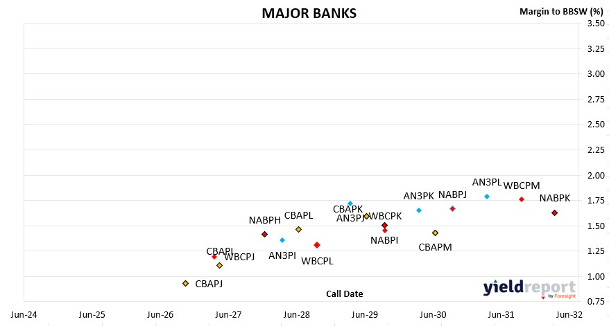 NAB’s hybrids span across several maturities, with NABPK (Capital Notes 8) offering a 5.80% yield and NABPH (Capital Notes 5) delivering 6.71%, one of the highest among major banks. The diversity in margins and call dates provides flexibility for income-focused investors.