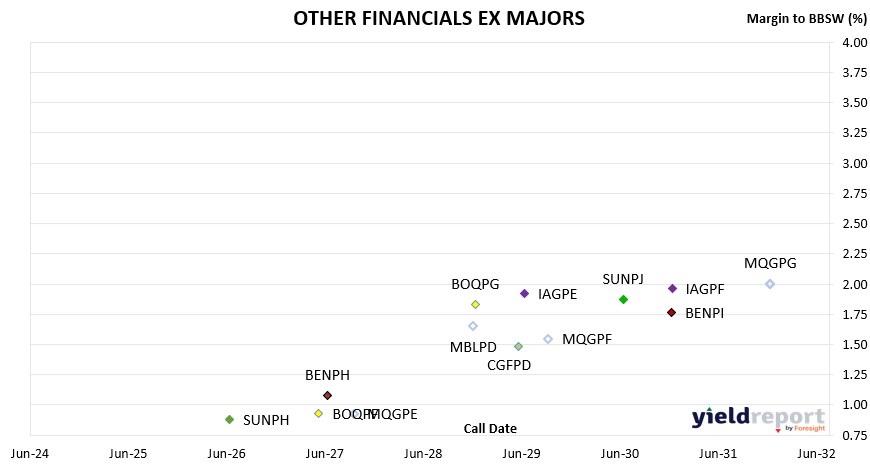 YIELD**Challenger CGFPC Capital Notes 3 25/05/2026 4.60% -0.22% 102.66 7.89% Nat Aust Bank NABPF Capital Notes 3 17/06/2026 4.00% 0.57% 101.94 7.35% Suncorp SUNPH Capital Notes 3 17/06/2026 3.00% 0.88% 101.13 6.42% Macquarie Group MQGPD Capital Notes 4 10/09/2026 4.15% 0.53% 102.95 7.43% CBA CBAPJ PERLS 13 20/10/2026 2.75% 0.93% 101.56 6.15% Latitude LFSPA Capital Notes 27/10/2026 4.75% 6.06% 98.50 8.35% Westpac WBCPJ Capital Notes 7 22/03/2027 3.40% 1.19% 102.80 6.71% CBA CBAPI PERLS 12 20/04/2027 3.00% 1.11% 102.50 6.34% Bank of Queensland BOQPF Capital Notes 2 14/05/2027 3.80% 0.93% 104.19 7.01% Bendigo Bank BENPH Capital Notes 15/06/2027 3.80% 1.08% 104.02 7.01% Macquarie Group MQGPE Capital Notes 5 20/09/2027 2.90% 0.93% 102.70 6.19% Nat Aust Bank NABPH Capital Notes 5 17/12/2027 3.50% 1.42% 103.94 6.73% ANZ Bank AN3PI Capital Notes 6 20/03/2028 3.00% 1.35% 103.50 6.28% CBA CBAPL PERLS 15 15/06/2028 2.85% 1.47% 103.18 6.15% Suncorp SUNPI Capital Notes 4 17/06/2028 2.90% 1.55% 103.10 6.21% Westpac WBCPL Capital Notes 9 22/09/2028 3.40% 1.31% 105.30 6.55% Macquarie Bank MBLPD Capital Notes 3 7/12/2028 2.90% 1.65% 103.40 6.19% Bank of Queensland BOQPG Capital Notes 3 15/12/2028 3.40% 1.83% 104.20 6.62% Judo Capital JDOPA Capital Notes 16/02/2029 6.50% 4.50% 111.71 9.40% ANZ Bank AN3PJ Capital Notes 7 20/03/2029 2.70% 1.72% 102.85 6.03% Challenger CGFPD Capital Notes 4 25/05/2029 3.60% 1.48% 106.50 6.67% CBA CBAPK PERLS 14 15/06/2029 2.75% 1.60% 103.54 6.04% IAG IAGPE Capital Notes 2 15/06/2029 3.50% 1.92% 104.90 6.67% Macquarie Group MQGPF Capital Notes 6 12/09/2029 3.70% 1.55% 107.00 6.73% Nat Aust Bank NABPI Capital Notes 6 17/09/2029 3.15% 1.51% 105.34 6.31% Westpac WBCPK Capital Notes 8 21/09/2029 2.90% 1.46% 104.74 6.11% ANZ Bank AN3PK Capital Notes 8 20/03/2030 2.75% 1.65% 104.00 6.01% CBA CBAPM PERLS 16 17/06/2030 3.00% 1.43% 105.92 6.14% Suncorp SUNPJ Capital Notes 5 17/06/2030 2.80% 1.87% 103.51 6.08% Nat Aust Bank NABPJ Capital Notes 7 17/09/2030 2.80% 1.67% 104.46 6.03% Bendigo Bank BENPi Capital Notes 2 13/12/2030 3.20% 1.77% 105.85 6.33% Insurance Australia IAGPF Capital Notes 3 15/12/2030 3.20% 1.96% 105.14 6.38% ANZ Bank AN3PL Capital Notes 9 20/03/2031 2.90% 1.79% 104.78 6.11% Westpac WBCPM Capital Notes 10 22/09/2031 3.10% 1.76% 106.14 6.22% Macquarie Group MQGPG Capital Notes 7 15/12/2031 2.65% 2.00% 103.15 5.96% Nat Aust Bank NABPK Capital Notes 8 17/03/2032 2.60% 1.63% 104.76 5.82% ASX-Listed Hybrids (Non-standard) 27.10.25