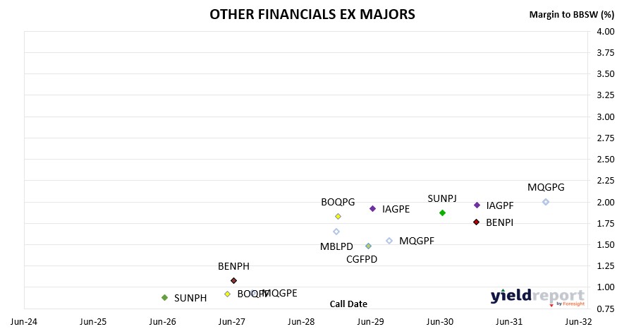 YIELD**Challenger CGFPC Capital Notes 3 25/05/2026 4.60% -0.23% 102.66 7.88% Nat Aust Bank NABPF Capital Notes 3 17/06/2026 4.00% 0.57% 101.94 7.34% Suncorp SUNPH Capital Notes 3 17/06/2026 3.00% 0.88% 101.13 6.41% Macquarie Group MQGPD Capital Notes 4 10/09/2026 4.15% 0.53% 102.95 7.42% CBA CBAPJ PERLS 13 20/10/2026 2.75% 0.93% 101.56 6.14% Latitude LFSPA Capital Notes 27/10/2026 4.75% 6.06% 98.50 8.34% Westpac WBCPJ Capital Notes 7 22/03/2027 3.40% 1.19% 102.80 6.70% CBA CBAPI PERLS 12 20/04/2027 3.00% 1.11% 102.50 6.33% Bank of Queensland BOQPF Capital Notes 2 14/05/2027 3.80% 0.93% 104.19 7.00% Bendigo Bank BENPH Capital Notes 15/06/2027 3.80% 1.08% 104.02 7.00% Macquarie Group MQGPE Capital Notes 5 20/09/2027 2.90% 0.93% 102.70 6.18% Nat Aust Bank NABPH Capital Notes 5 17/12/2027 3.50% 1.42% 103.94 6.72% ANZ Bank AN3PI Capital Notes 6 20/03/2028 3.00% 1.36% 103.50 6.27% CBA CBAPL PERLS 15 15/06/2028 2.85% 1.47% 103.18 6.14% Suncorp SUNPI Capital Notes 4 17/06/2028 2.90% 1.55% 103.10 6.20% Westpac WBCPL Capital Notes 9 22/09/2028 3.40% 1.31% 105.30 6.54% Macquarie Bank MBLPD Capital Notes 3 7/12/2028 2.90% 1.65% 103.40 6.18% Bank of Queensland BOQPG Capital Notes 3 15/12/2028 3.40% 1.83% 104.20 6.61% Judo Capital JDOPA Capital Notes 16/02/2029 6.50% 4.60% 111.71 9.50% ANZ Bank AN3PJ Capital Notes 7 20/03/2029 2.70% 1.72% 102.85 6.02% Challenger CGFPD Capital Notes 4 25/05/2029 3.60% 1.48% 106.50 6.66% CBA CBAPK PERLS 14 15/06/2029 2.75% 1.60% 103.54 6.03% IAG IAGPE Capital Notes 2 15/06/2029 3.50% 1.92% 104.90 6.66% Macquarie Group MQGPF Capital Notes 6 12/09/2029 3.70% 1.55% 107.00 6.72% Nat Aust Bank NABPI Capital Notes 6 17/09/2029 3.15% 1.51% 105.34 6.30% Westpac WBCPK Capital Notes 8 21/09/2029 2.90% 1.46% 104.74 6.10% ANZ Bank AN3PK Capital Notes 8 20/03/2030 2.75% 1.65% 104.00 6.00% CBA CBAPM PERLS 16 17/06/2030 3.00% 1.44% 105.92 6.13% Suncorp SUNPJ Capital Notes 5 17/06/2030 2.80% 1.87% 103.51 6.07% Nat Aust Bank NABPJ Capital Notes 7 17/09/2030 2.80% 1.67% 104.46 6.02% Bendigo Bank BENPi Capital Notes 2 13/12/2030 3.20% 1.77% 105.85 6.32% Insurance Australia IAGPF Capital Notes 3 15/12/2030 3.20% 1.96% 105.14 6.36% ANZ Bank AN3PL Capital Notes 9 20/03/2031 2.90% 1.79% 104.78 6.10% Westpac WBCPM Capital Notes 10 22/09/2031 3.10% 1.76% 106.14 6.21% Macquarie Group MQGPG Capital Notes 7 15/12/2031 2.65% 2.00% 103.15 5.95% Nat Aust Bank NABPK Capital Notes 8 17/03/2032 2.60% 1.63% 104.76 5.81% ASX-Listed Hybrids (Non-standard) 28.10.25