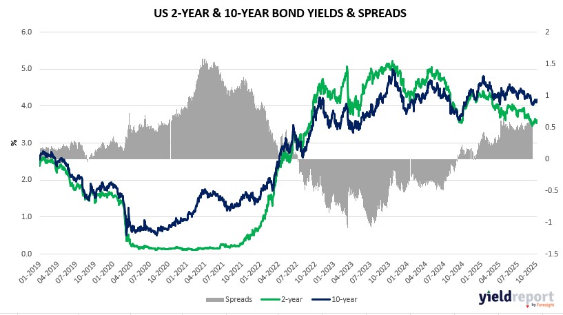 Treasury yields ticked lower on October 14, 2025, with the 10-year dipping one basis point to 4.03% and the two-year falling three to 3.48%, reflecting haven bids amid trade jitters and Powell’s dovish tilt on liquidity measures. The 30-year held steady at 4.63%, as two-year notes hit lows not seen since 2022 on expectations of Fed easing to counter job-market softening.