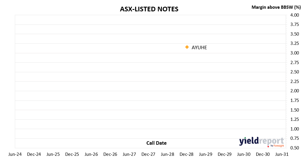 The accompanying chart highlights AYUHE’s position with a 3.25% margin above BBSW and a call date around June 2027, placing it in the mid-range of the FRN universe. This visual reinforces the limited issuance in the listed FRN space and the potential for price discovery as more notes enter the market. Overall, the data suggests a clear tiering among issuers, with spreads reflecting both credit perception and liquidity, while the floating-rate structure continues to attract tactical allocations amid elevated short-term rates.