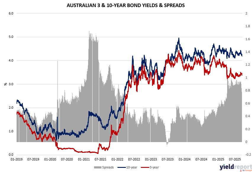 Australian government bond yields edged higher on September 18, 2025, as the labor market’s unexpected contraction tempered easing bets and global yields firmed post-Fed, pressuring prices ahead of weekend positioning. The 2-year yield held at 3.36%, the 5-year rose 1 basis point to 3.65%, the 10-year climbed 2 basis points to 4.24%, and the 15-year advanced 3 basis points to 4.60%. The uptick blended domestic weakness with offshore momentum, as August’s 5.4 thousand job loss—far below 21.5 thousand expected—kept unemployment at 4.2% but highlighted softening demand, per eToro’s Farhan Badami, potentially forcing RBA reconsideration of its 3.60% stance despite steadying the dial on aggressive cuts.