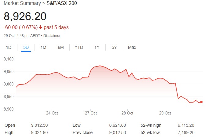 The Australian share market closed lower on October 29, 2025, with the S&P/ASX 200 dropping 0.96% to 8926.2 and the All Ordinaries down 0.83% to 9218.8, hitting a two-week low after hotter-than-expected September quarter inflation data dashed hopes for near-term rate cuts. The CPI rose 1.3% quarterly and 3.2% annually, beating forecasts of 1.1% and 3.0%, while the RBA’s trimmed mean measure climbed 1.0% quarterly to 3.0% annually, overshooting estimates and landing at the top of the 2-3% target band. This “material miss” relative to the RBA’s August forecasts, as noted by experts like Diana Mousina, reinforced a hold at next week’s meeting and eroded chances for easing before 2026, with Westpac’s Luci Ellis highlighting risks of delayed cuts leading to more aggressive moves later amid labor softening.