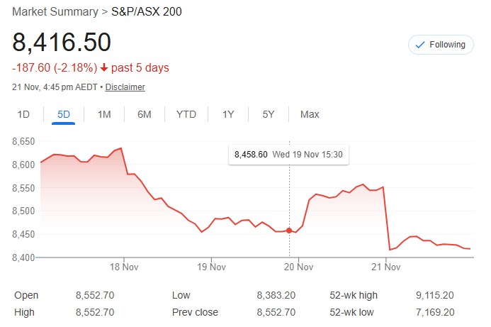 Australian shares tumbled on November 21, 2025, closing at their lowest since June amid global risk-off waves from US AI jitters and reduced Fed cut expectations. The S&P/ASX 200 fell 1.59% to 8416.5, the All Ordinaries dropped 1.67% to 8686.3, and the Small Ordinaries plunged 2.99% to 3519.4. Losses spanned 10 of 11 sectors, with materials cratering 3.93% on softer commodity prices, energy down 3.11% amid oil weakness, and real estate off 1.97%. Consumer staples eked out a 0.04% gain as a defensive haven, while health care closed flat.