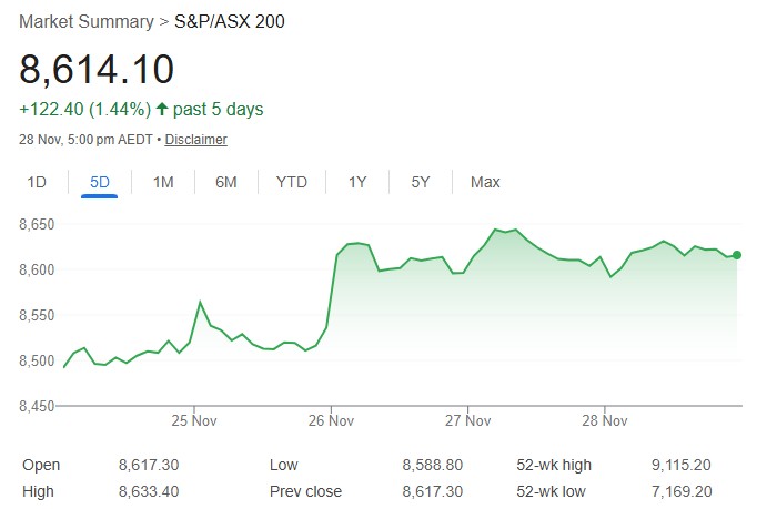 Australian equities closed mixed on November 28, 2025, in a low-volume session amid US holiday aftermath, snapping a four-week ASX 200 losing streak with the benchmark’s best weekly gain since May. The S&P/ASX 200 dipped 3.2 points or 0.04% to 8,614.1, while the All Ordinaries rose 6.7 points or 0.08% to 8,918.7. Advancers outnumbered decliners 181 to 98 in the ASX 300, with the index up 2.4% weekly, 2.4% from intraweek low.