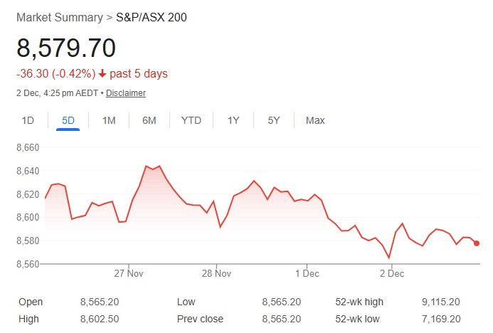 The S&P/ASX 200 closed up 0.17% at 8,579.7 on December 2, 2025, grinding out a modest gain in a lackluster session amid mixed global cues and rising bond yields. The All Ordinaries rose 0.13% to 8,877.5, with advancers edging decliners 144 to 129. Energy led gains at 1.08%, buoyed by coal sector strength, while Materials added 0.74% on commodity resilience. Coronado Global Resources climbed 7.1% and Stanmore Resources 3.9% amid broader coal firmness. Consumer Staples rose 0.46% and Real Estate 0.43%, but Information Technology plunged 1.55%, dragging the All Tech index down 1.12%. Health Care was flat, Financials unchanged, and Utilities fell 0.41%.