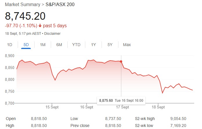 Australian shares extended losses on September 18, 2025, hammered by a collapse in energy stocks after Abu Dhabi National Oil Company withdrew from a $28 billion takeover bid for Santos, while softer-than-expected jobs data fueled debates over Reserve Bank easing. The S&P/ASX 200 slid 0.83% to 8,745.2, with the broader All Ordinaries down 0.70% to 9,030.9. Energy cratered 5.90%, led by Santos tumbling 11.9% to $6.74, Woodside Energy off 6.3%, and Beach Energy down 4.5%, as the failed deal rippled through the sector without clear oil price triggers. Financials fell 0.88% with Commonwealth Bank dropping over 2% to $164.33, its weakest since April, while materials eased 0.51% as iron ore prices softened, dragging BHP 0.8%, Fortescue 0.7%, and Rio Tinto 0.7%.