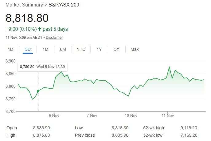 Australian shares closed lower on November 11, 2025, dragged by a sharp sell-off in financials amid banking updates, though resources and utilities provided some offset. The S&P/ASX 200 dipped 0.19% to 8,818.8, while the All Ordinaries fell 0.12% to 9,098.4. The session started higher on US shutdown optimism but reversed as Commonwealth Bank tumbled, wiping out broader gains despite positive consumer sentiment data.