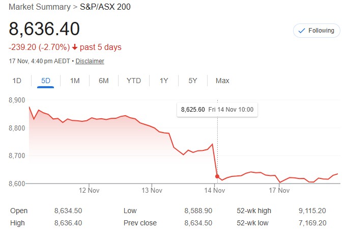 Australian shares edged higher on November 17, 2025, snapping a potential fifth straight decline as late buying lifted the market to a flat close amid thin trading and ahead of RBA minutes. The S&P/ASX 200 rose 0.02% to 8,636.4, bouncing from an early 0.53% drop, while the All Ordinaries gained 0.10% to 8,915.7. The rebound reflected dip-buying after a 5% pullback from October’s record high of 9,115.2, with roughly two-thirds of top 300 stocks advancing. Small Ords climbed 0.84%, All Tech surged 1.21%, and Emerging Companies added 0.40%.