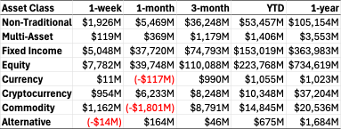 The value of ETF flows data is relatively obvious – it highlights asset class inflows and outflows. As such, it illustrates investor asset class preferences at any given time. Relative to the ASX data, which is monthly, US data is available on both a more frequent and timely basis. The data below is as at 29 May 2025.