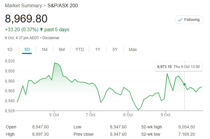 Australia’s share market ended higher on October 9, 2025, snapping a three-session slide as materials surged 1.80% on copper and rare earths strength, lifting the S&P/ASX 200 by 0.25% to 8,969.8 and All Ordinaries up 0.34% to 9,276.6. Small caps outperformed at 0.63%, emerging companies up 1.44%. Sandfire Resources rose 5.3%, Capstone Copper added 7.6%, Arafura Rare Earths gained 8.8%, Lynas up 5.3%. Infini Resources soared 226.1% on uranium hits, Marmota jumped 41.2% on gold grades.
