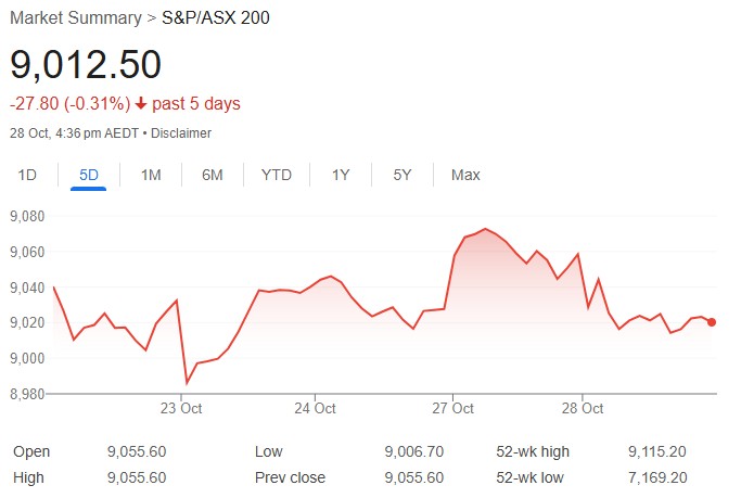 The Australian share market closed lower on October 29, 2025, reversing prior gains amid stock-specific shocks and weakness in mining and health care sectors. The S&P/ASX 200 fell 0.48% to 9,012.5, while the broader All Ordinaries dropped 0.60% to 9,295.8. Health care plunged 7.40% as CSL tumbled 15.9% after slashing earnings guidance at its AGM, while information technology slid 3.16% with WiseTech Global down 15.9% following ASIC and AFP raids over alleged improper trading. Materials declined 2.02% and energy 1.69%, hit by falling commodity prices and US-China trade thaw signals reducing safe-haven demand.