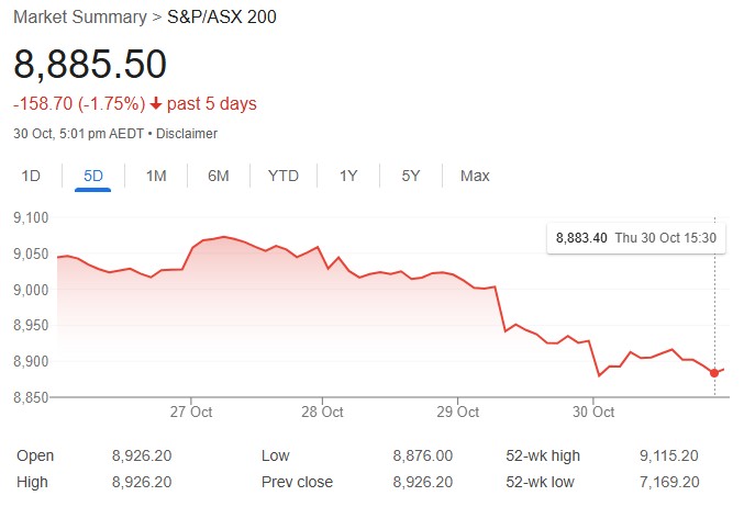 Australia’s share market slid to two-week lows on October 30, 2025, as hotter-than-expected inflation data dashed hopes for further Reserve Bank rate cuts, outweighing limited uplift from US-China trade headlines. The S&P/ASX 200 dropped 0.46% to 8,885.5, while the All Ordinaries fell 0.43% to 9,178.9. Consumer discretionary plunged 4.19%, dragged by Wesfarmers down 7.0% after its AGM addressed a proposed cash flow tax, and JB Hi-Fi off 4.5% despite a quarterly update showing stagnant appliance sales. Real estate tumbled 2.27% and information technology lost 1.53% amid revised rate outlooks.