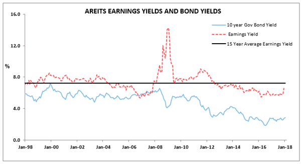 At the end of February, the earnings yields exceeded the 10-year Australian government bond yield by 3.74%, which is higher than the long term average of 2.76%. The premium over the bond yield was unchanged compared to the end of January. All AREITs sectors increased their average forecast earning yields1.