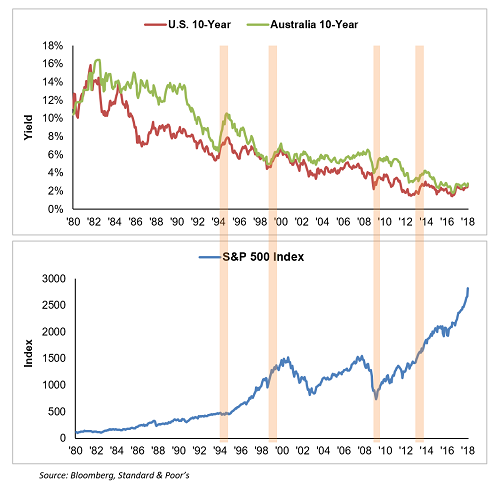 It’s an interesting comparison to consider this period in terms of the more recent sell off. What did the S&P500 return in calendar 1994 when US 10-year yields rose around 200 basis points? The index itself fell a modest 1.6% but returned a small positive of around 1.3% after dividends. What about other episodes of rising bond yields?
