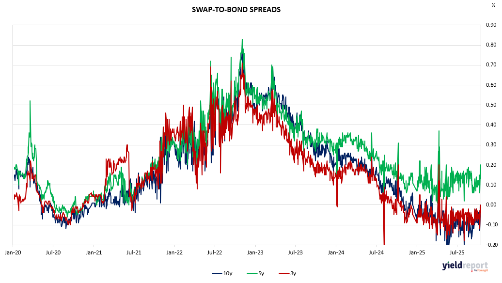 Swap rates declined sharply across all maturities during the week. The 1-year rate fell 14 bps to 3.34%, while the 3-year and 5-year tenors dropped 19 bps each to 3.35% and 3.72% respectively. Longer-term yields also retreated, with the 10-year down 17 bps to 4.15%, and the 15-year falling 19 bps to 4.35%. Monthly changes were more muted, with most tenors showing slight declines or flat movement.