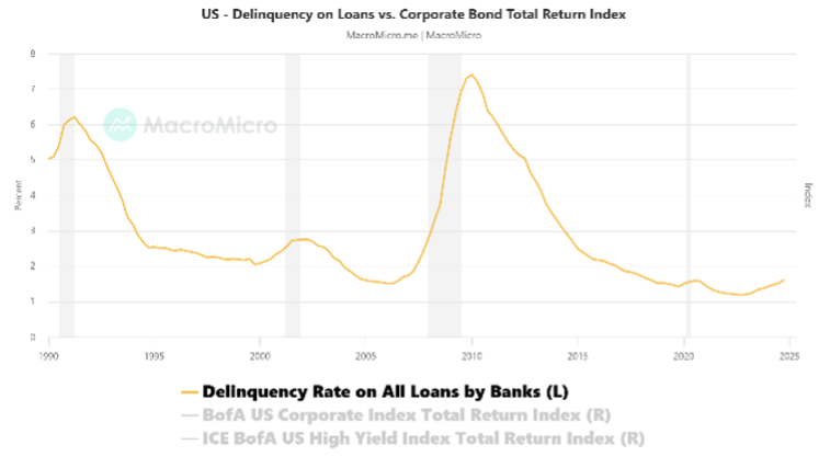 In relation to Figure 2, the US Fed surveys large commercial banks on the delinquency rates on loans and leases each quarter. As delinquency rates on loans and leases reflect the overall debt repayment capacity of businesses, delinquency rates serve as an important indicator of corporate bond defaults. The latest statistics are very solid: Delinquency Rate on All Loans by Banks (2024-Q4): 1.62%. Previous month: 1.52%