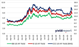 Corporate bonds moved slightly higher. By Friday close, the high yield aggregate yield had increased 6 bps to 7.75%, the BB 4bps to 6.36%, the B 4bps to 7.88% and the CCC 2bps to 13.70%. It was actually a de-risk week.