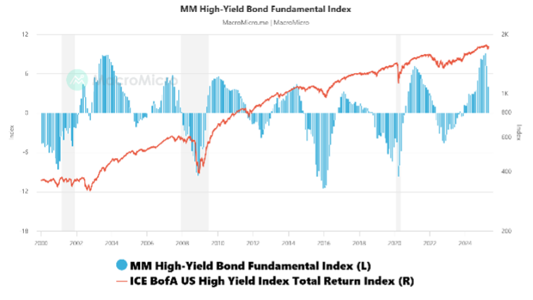 In relation to Figure 1, the MM Fundamental Index for high-yield bonds is an integral index for assessing the fundamentals of junk bonds. When it goes up, the fundamentals of junk bonds are looking good. The Fundamental Index is updated with the monthly value on the last Friday of each month, and there may be subsequent changes due to data revisions for its constituent variables.