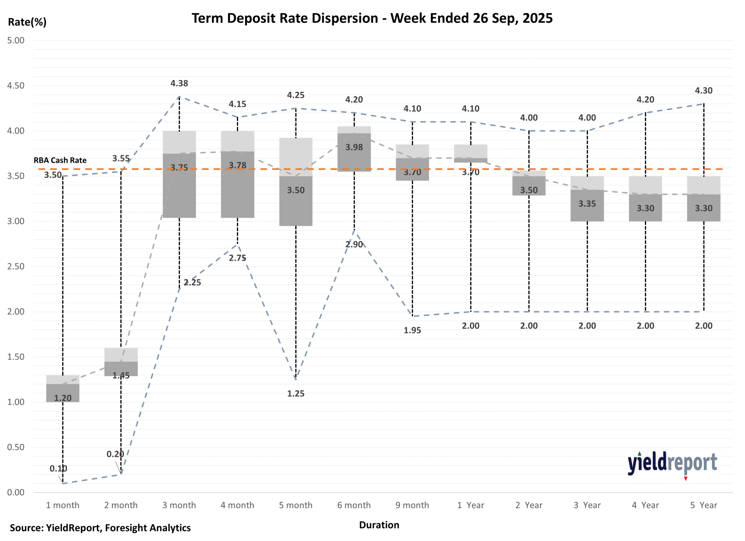 Interestingly, the best 5-year rate held at 4.30%, led by Judo Bank and Rabobank Australia. The median rate held at 3.30%, with a range from 2.00% to 4.30%.