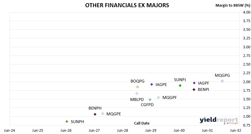 Macquarie Capital Notes 4 (MQGPD) held at $102.95 with a 7.57% running yield, continuing to offer a premium relative to the major banks due to higher perceived volatility in Macquarie’s earnings outlook.