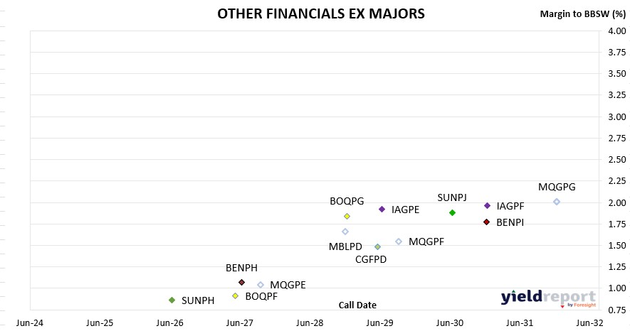YIELD**Challenger CGFPC Capital Notes 3 25/05/2026 4.60% -0.43% 102.66 8.01% Nat Aust Bank NABPF Capital Notes 3 17/06/2026 4.00% 0.47% 101.94 7.47% Suncorp SUNPH Capital Notes 3 17/06/2026 3.00% 0.86% 101.13 6.55% Macquarie Group MQGPD Capital Notes 4 10/09/2026 4.15% 0.44% 102.95 7.55% CBA CBAPJ PERLS 13 20/10/2026 2.75% 0.94% 101.56 6.28% Latitude LFSPA Capital Notes 27/10/2026 4.75% 6.21% 98.50 8.48% Westpac WBCPJ Capital Notes 7 22/03/2027 3.40% 1.18% 102.80 6.83% CBA CBAPI PERLS 12 20/04/2027 3.00% 1.12% 102.50 6.46% Bank of Queensland BOQPF Capital Notes 2 14/05/2027 3.80% 0.62% 104.19 7.10% Bendigo Bank BENPH Capital Notes 15/06/2027 3.80% 1.07% 104.02 7.13% Macquarie Group MQGPE Capital Notes 5 20/09/2027 2.90% 1.05% 102.70 6.32% Nat Aust Bank NABPH Capital Notes 5 17/12/2027 3.50% 1.42% 103.94 6.85% ANZ Bank AN3PI Capital Notes 6 20/03/2028 3.00% 1.36% 103.50 6.40% CBA CBAPL PERLS 15 15/06/2028 2.85% 1.48% 103.18 6.27% Suncorp SUNPI Capital Notes 4 17/06/2028 2.90% 1.56% 103.10 6.33% Westpac WBCPL Capital Notes 9 22/09/2028 3.40% 1.30% 105.30 6.67% Macquarie Bank MBLPD Capital Notes 3 7/12/2028 2.90% 1.66% 103.40 6.31% Bank of Queensland BOQPG Capital Notes 3 15/12/2028 3.40% 1.84% 104.20 6.74% Judo Capital JDOPA Capital Notes 16/02/2029 6.50% 4.60% 111.71 9.60% ANZ Bank AN3PJ Capital Notes 7 20/03/2029 2.70% 1.73% 102.85 6.15% Challenger CGFPD Capital Notes 4 25/05/2029 3.60% 1.48% 106.50 6.79% CBA CBAPK PERLS 14 15/06/2029 2.75% 1.61% 103.54 6.16% IAG IAGPE Capital Notes 2 15/06/2029 3.50% 1.92% 104.90 6.79% Macquarie Group MQGPF Capital Notes 6 12/09/2029 3.70% 1.55% 107.00 6.84% Nat Aust Bank NABPI Capital Notes 6 17/09/2029 3.15% 1.51% 105.34 6.43% Westpac WBCPK Capital Notes 8 21/09/2029 2.90% 1.46% 104.74 6.23% ANZ Bank AN3PK Capital Notes 8 20/03/2030 2.75% 1.66% 104.00 6.13% CBA CBAPM PERLS 16 17/06/2030 3.00% 1.44% 105.92 6.25% Suncorp SUNPJ Capital Notes 5 17/06/2030 2.80% 1.89% 103.51 6.21% Nat Aust Bank NABPJ Capital Notes 7 17/09/2030 2.80% 1.68% 104.46 6.15% Bendigo Bank BENPi Capital Notes 2 13/12/2030 3.20% 1.77% 105.85 6.45% Insurance Australia IAGPF Capital Notes 3 15/12/2030 3.20% 1.96% 105.14 6.49% ANZ Bank AN3PL Capital Notes 9 20/03/2031 2.90% 1.80% 104.78 6.23% Westpac WBCPM Capital Notes 10 22/09/2031 3.10% 1.76% 106.14 6.33% Macquarie Group MQGPG Capital Notes 7 15/12/2031 2.65% 2.01% 103.15 6.08% Nat Aust Bank NABPK Capital Notes 8 17/03/2032 2.60% 1.64% 104.76 5.94% -