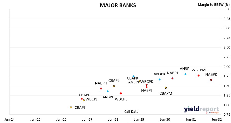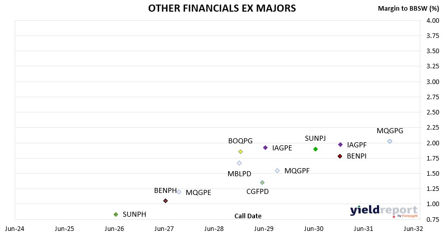 YIELD**Challenger CGFPC Capital Notes 3 25/05/2026 4.60% -1.66% 102.66 8.02% Nat Aust Bank NABPF Capital Notes 3 17/06/2026 4.00% 0.34% 101.94 7.52% Suncorp SUNPH Capital Notes 3 17/06/2026 3.00% 0.83% 101.13 6.59% Macquarie Group MQGPD Capital Notes 4 10/09/2026 4.15% 0.33% 102.95 7.59% CBA CBAPJ PERLS 13 20/10/2026 2.75% 0.94% 101.56 6.32% Latitude LFSPA Capital Notes 27/10/2026 4.75% 6.40% 98.50 8.52% Westpac WBCPJ Capital Notes 7 22/03/2027 3.40% 1.16% 102.80 6.87% CBA CBAPI PERLS 12 20/04/2027 3.00% 1.12% 102.50 6.50% Bank of Queensland BOQPF Capital Notes 2 14/05/2027 3.80% 0.58% 104.19 7.14% Bendigo Bank BENPH Capital Notes 15/06/2027 3.80% 1.05% 104.02 7.18% Macquarie Group MQGPE Capital Notes 5 20/09/2027 2.90% 1.20% 102.70 6.38% Nat Aust Bank NABPH Capital Notes 5 17/12/2027 3.50% 1.43% 103.94 6.89% ANZ Bank AN3PI Capital Notes 6 20/03/2028 3.00% 1.36% 103.50 6.44% CBA CBAPL PERLS 15 15/06/2028 2.85% 1.49% 103.18 6.31% Suncorp SUNPI Capital Notes 4 17/06/2028 2.90% 1.58% 103.10 6.37% Westpac WBCPL Capital Notes 9 22/09/2028 3.40% 1.30% 105.30 6.71% Macquarie Bank MBLPD Capital Notes 3 7/12/2028 2.90% 1.67% 103.40 6.35% Bank of Queensland BOQPG Capital Notes 3 15/12/2028 3.40% 1.86% 104.20 6.78% Judo Capital JDOPA Capital Notes 16/02/2029 6.50% 4.60% 111.71 9.60% ANZ Bank AN3PJ Capital Notes 7 20/03/2029 2.70% 1.74% 102.85 6.19% Challenger CGFPD Capital Notes 4 25/05/2029 3.60% 1.36% 106.50 6.80% CBA CBAPK PERLS 14 15/06/2029 2.75% 1.63% 103.54 6.20% IAG IAGPE Capital Notes 2 15/06/2029 3.50% 1.92% 104.90 6.83% Macquarie Group MQGPF Capital Notes 6 12/09/2029 3.70% 1.55% 107.00 6.88% Nat Aust Bank NABPI Capital Notes 6 17/09/2029 3.15% 1.52% 105.34 6.47% Westpac WBCPK Capital Notes 8 21/09/2029 2.90% 1.47% 104.74 6.27% ANZ Bank AN3PK Capital Notes 8 20/03/2030 2.75% 1.67% 104.00 6.17% CBA CBAPM PERLS 16 17/06/2030 3.00% 1.45% 105.92 6.29% Suncorp SUNPJ Capital Notes 5 17/06/2030 2.80% 1.90% 103.51 6.25% Nat Aust Bank NABPJ Capital Notes 7 17/09/2030 2.80% 1.69% 104.46 6.19% Bendigo Bank BENPi Capital Notes 2 13/12/2030 3.20% 1.79% 105.85 6.49% Insurance Australia IAGPF Capital Notes 3 15/12/2030 3.20% 1.97% 105.14 6.53% ANZ Bank AN3PL Capital Notes 9 20/03/2031 2.90% 1.80% 104.78 6.27% Westpac WBCPM Capital Notes 10 22/09/2031 3.10% 1.77% 106.14 6.37% Macquarie Group MQGPG Capital Notes 7 15/12/2031 2.65% 2.03% 103.15 6.12% Nat Aust Bank NABPK Capital Notes 8 17/03/2032 2.60% 1.65% 104.76 5.98% ASX-Listed Hybrids (Non-standard) 02.12.25