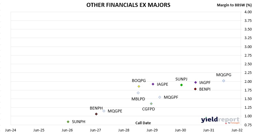 YIELD**Challenger CGFPC Capital Notes 3 25-05-2026 4.60% -1.51% 102.66 8.00% Nat Aust Bank NABPF Capital Notes 3 17-06-2026 4.00% 0.39% 101.94 7.50% Suncorp SUNPH Capital Notes 3 17-06-2026 3.00% 0.84% 101.13 6.57% Macquarie Group MQGPD Capital Notes 4 10-09-2026 4.15% 0.36% 102.95 7.57% CBA CBAPJ PERLS 13 20-10-2026 2.75% 0.94% 101.56 6.30% Latitude LFSPA Capital Notes 27-10-2026 4.75% 6.34% 98.50 8.50% Westpac WBCPJ Capital Notes 7 22-03-2027 3.40% 1.16% 102.80 6.85% CBA CBAPI PERLS 12 20-04-2027 3.00% 1.12% 102.50 6.48% Bank of Queensland BOQPF Capital Notes 2 14-05-2027 3.80% 0.59% 104.19 7.12% Bendigo Bank BENPH Capital Notes 15-06-2027 3.80% 1.06% 104.02 7.15% Macquarie Group MQGPE Capital Notes 5 20-09-2027 2.90% 1.15% 102.70 6.35% Nat Aust Bank NABPH Capital Notes 5 17-12-2027 3.50% 1.43% 103.94 6.87% ANZ Bank AN3PI Capital Notes 6 20-03-2028 3.00% 1.36% 103.50 6.42% CBA CBAPL PERLS 15 15-06-2028 2.85% 1.49% 103.18 6.29% Suncorp SUNPI Capital Notes 4 17-06-2028 2.90% 1.57% 103.10 6.35% Westpac WBCPL Capital Notes 9 22-09-2028 3.40% 1.30% 105.30 6.69% Macquarie Bank MBLPD Capital Notes 3 07-12-2028 2.90% 1.67% 103.40 6.33% Bank of Queensland BOQPG Capital Notes 3 15-12-2028 3.40% 1.85% 104.20 6.76% Judo Capital JDOPA Capital Notes 16-02-2029 6.50% 4.60% 111.71 9.60% ANZ Bank AN3PJ Capital Notes 7 20-03-2029 2.70% 1.74% 102.85 6.17% Challenger CGFPD Capital Notes 4 25-05-2029 3.60% 1.36% 106.50 6.78% CBA CBAPK PERLS 14 15-06-2029 2.75% 1.62% 103.54 6.18% IAG IAGPE Capital Notes 2 15-06-2029 3.50% 1.92% 104.90 6.81% Macquarie Group MQGPF Capital Notes 6 12-09-2029 3.70% 1.55% 107.00 6.86% Nat Aust Bank NABPI Capital Notes 6 17-09-2029 3.15% 1.52% 105.34 6.45% Westpac WBCPK Capital Notes 8 21-09-2029 2.90% 1.46% 104.74 6.25% ANZ Bank AN3PK Capital Notes 8 20-03-2030 2.75% 1.67% 104.00 6.15% CBA CBAPM PERLS 16 17-06-2030 3.00% 1.45% 105.92 6.27% Suncorp SUNPJ Capital Notes 5 17-06-2030 2.80% 1.90% 103.51 6.23% Nat Aust Bank NABPJ Capital Notes 7 17-09-2030 2.80% 1.69% 104.46 6.17% Bendigo Bank BENPi Capital Notes 2 13-12-2030 3.20% 1.78% 105.85 6.47% Insurance Australia IAGPF Capital Notes 3 15-12-2030 3.20% 1.97% 105.14 6.51% ANZ Bank AN3PL Capital Notes 9 20-03-2031 2.90% 1.80% 104.78 6.25% Westpac WBCPM Capital Notes 10 22-09-2031 3.10% 1.77% 106.14 6.35% Macquarie Group MQGPG Capital Notes 7 15-12-2031 2.65% 2.02% 103.15 6.10% Nat Aust Bank NABPK Capital Notes 8 17-03-2032 2.60% 1.65% 104.76 5.96% ASX-Listed Hybrids 26.11.25