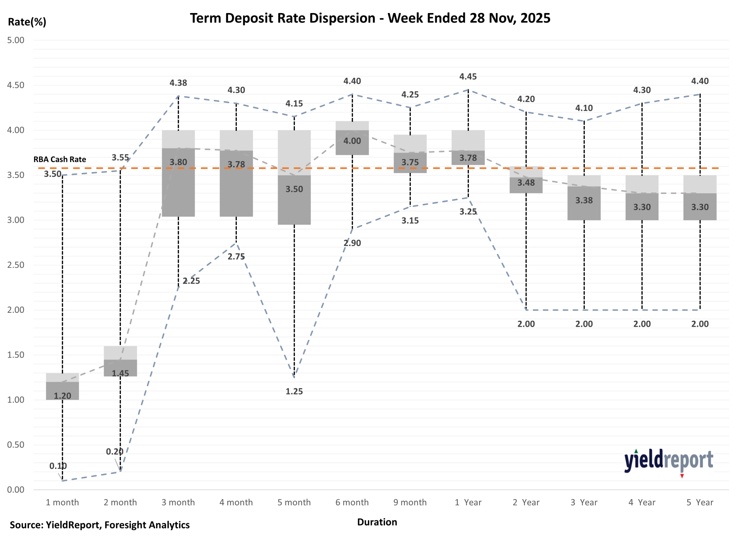 Interestingly, the best 5-year rate was 4.40%, up from 4.30% last week, led by Judo Bank. The median rate held at 3.30%, with a range from 2.00% to 4.40%.