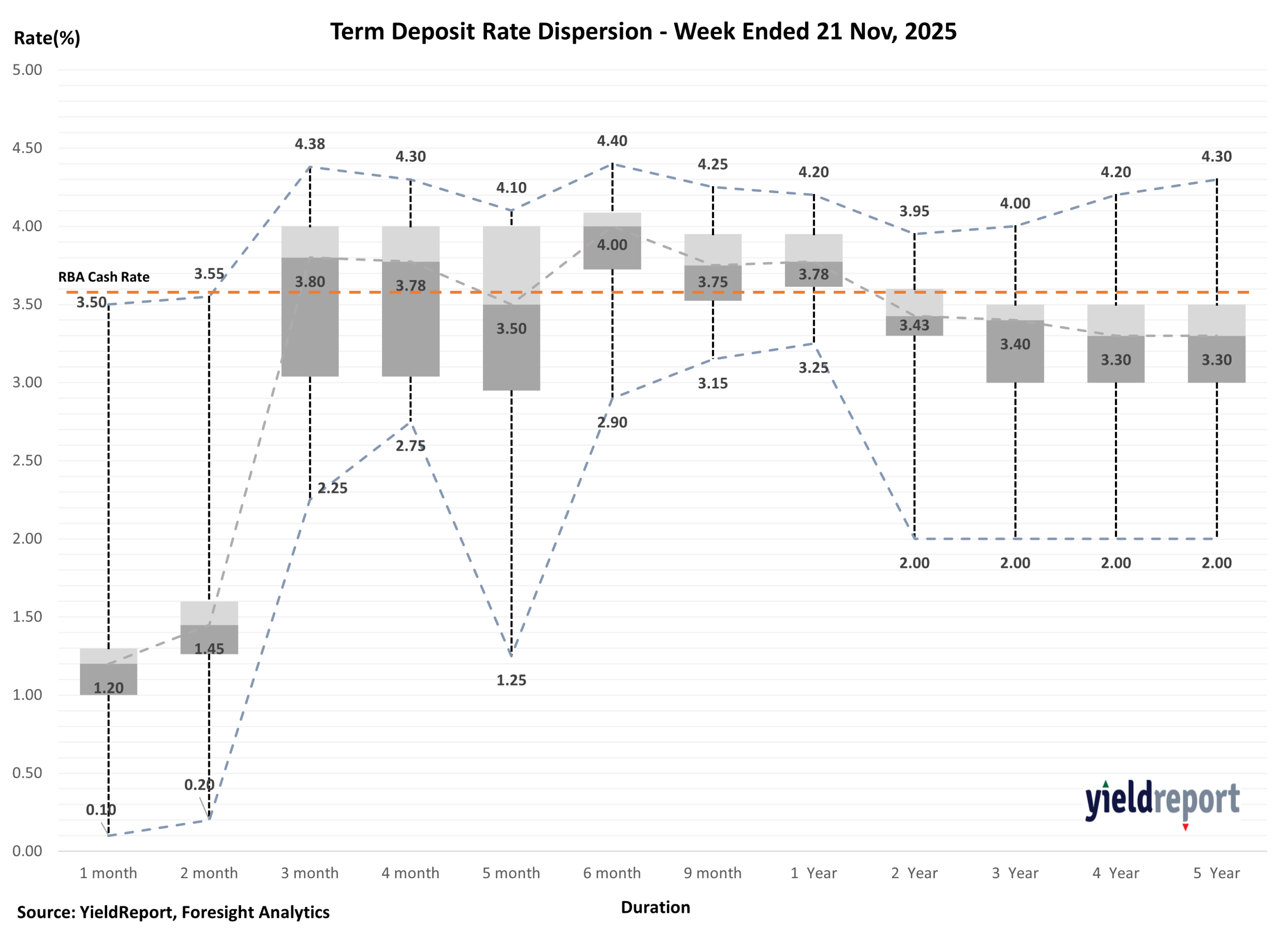 Interestingly, the best 5-year rate held steady at 4.30% from last week, led by Judo Bank and Rabobank Australia. The median rate remained stable at 3.30%, with a range from 2.00% to 4.30%.