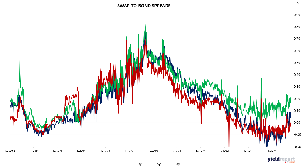 Swap-to-bond spread trends for 3-year, 5-year, and 10-year maturities, January 2020 to November 2025, with details on periods of volatility and trend toward zero