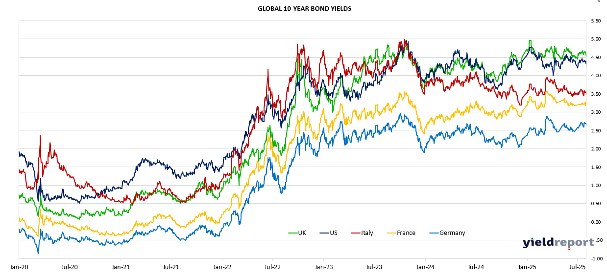 Australian government bond yields moved higher across the curve, driven by the stronger-than-expected inflation outlook and reduced expectations of early-2026 rate cuts. The Australian 3-year yield rose sharply by 13 bps to 3.89%, reaching a weekly high of 3.88% and signalling market concerns around sticky domestic inflation. Longer-dated yields also increased, though more modestly: the 10-year yield climbed 6 bps to 4.53%, while the 30-year yield inched up 2 bps to 5.12%. These moves suggest a mild bear-steepening as markets reassess duration risk and the RBA’s policy path.