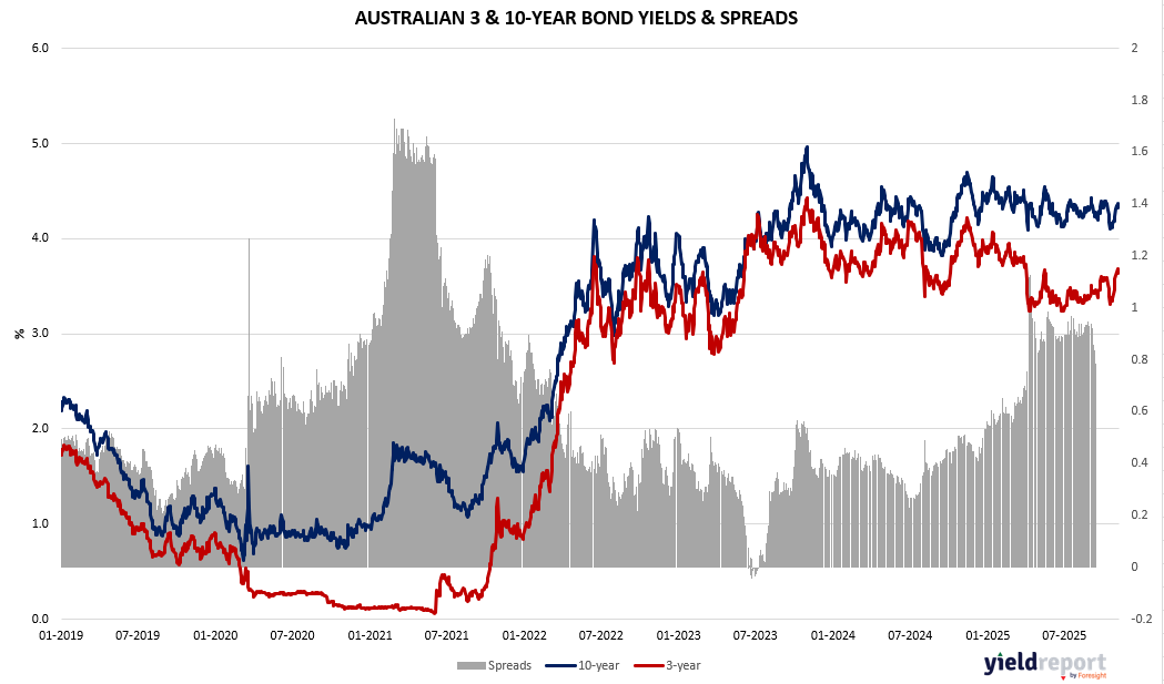Australian bond yields rose slightly over the week, with the 3-year up 3 basis points to 3.65%, the 10-year up 5bps to 4.36%, and the 30-year up 4bps to 4.99%. Short-term funding rates were steady, with the cash rate at 3.60% and the 3-month BBSW easing marginally to 3.64%. In the U.S., yields were mostly stable, with the 2-year down 4bps to 3.57%, the 10-year edging 1bp lower to 4.10%, and the 30-year up slightly to 4.70%. The Australian dollar weakened, falling 0.58% over the week to 64.81 US cents amid firmer global bond yields and renewed rate uncertainty.